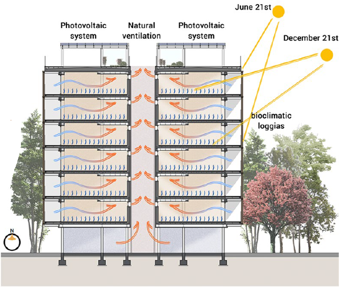 La ricostruzione permette una densificazione controllata (+60 appartamenti), maggiori spazi verdi, mobilità sostenibile, servizi di comunità e un disegno bioclimatico che ottimizza sole e ventilazione.