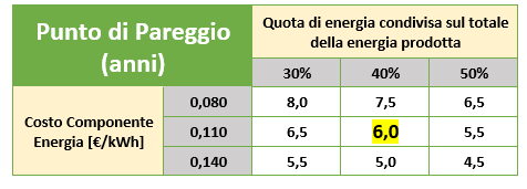 Nel caso per la realizzazione dell’impianto venga riconosciuto alla Comunità Energetica da Fonti Rinnovabili un contributo in conto capitale pari alla massima aliquota prevista (40 %) il punto di pareggio si riduce sensibilmente, con un intervallo 3,4 – 5,8 anni e un valore centrale di 4,3 anni.
