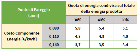 Segue una tabella riassuntiva della convenienza di un investimento in una Comunità Energetica Rinnovabile al cui servizio viene realizzato un impianto fotovoltaico di 200 kWp in Emilia Romagna. L’analisi è eseguita considerando modulabili il campo del costo della componente energia e quello della quota di energia condivisa sul totale della energia prodotta dall’impianto. Nell’analisi è stato ipotizzando un costo di investimento medio di 1.200,00 €/kWp e costi operativi e di gestione annuali del 2% dell’investimento.